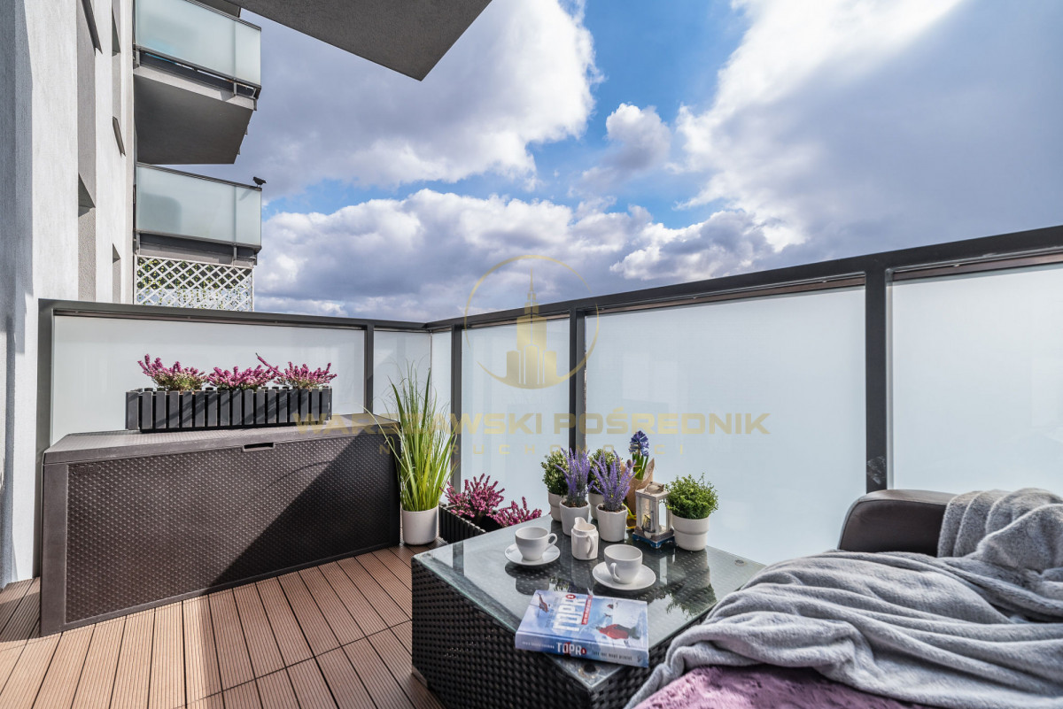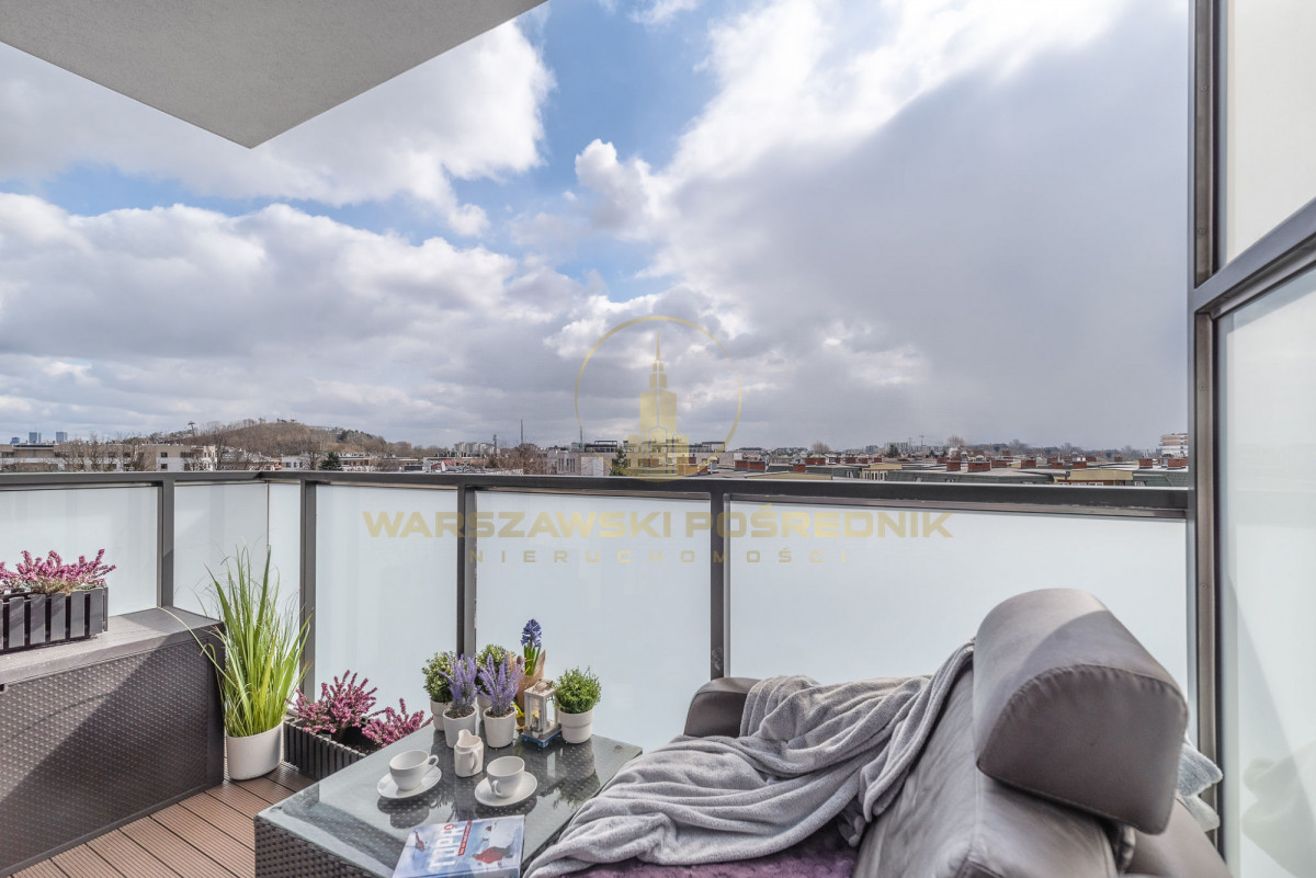 - przylegającego do salonu balkonu o powierzchni 6 m2 /od strony patio/ z ekspozycją na południe i pięknym widokiem na Górkę Szczęśliwicką i panoramę miasta