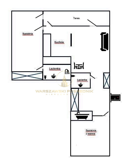 Mieszkanie ma świetny rozkład - jest podzielone na centralną, przestronną część dzienną oraz 2 komfortowe sypialnie z łazienkami, na przeciwległych krańcach mieszkania. Umożliwia to bezproblemowe funkcjonowanie 2 niezależnych osób czy par , które mogą korzystać ze wspólnej kuchni, salonu i tarasu .